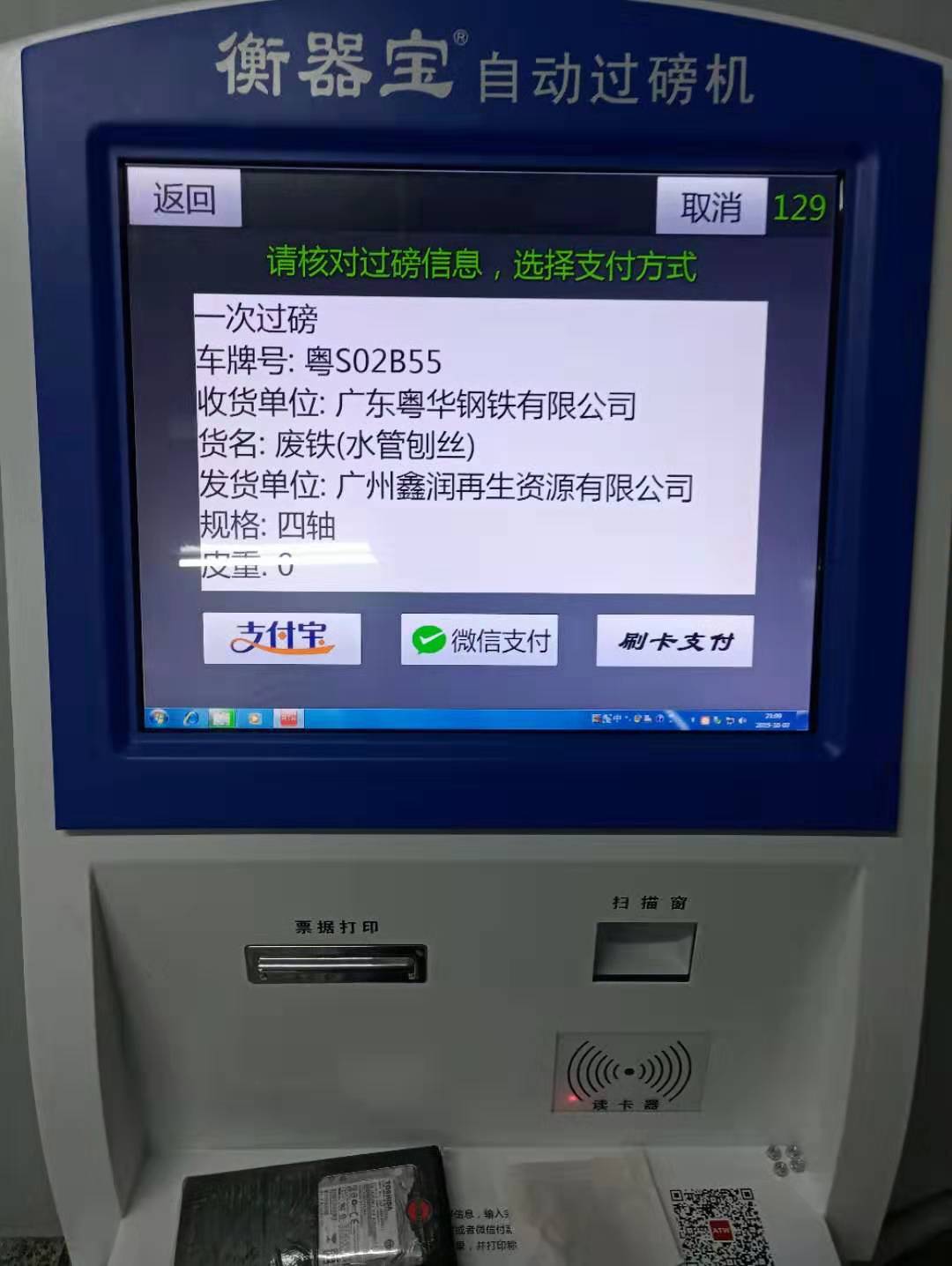 2、 分內(nèi)部車和外部車、內(nèi)部車過磅不需收費,(輸入供貨單位,物料名稱),后刷卡自動打印磅單;外部車輛需要收費(輸入供貨單位,物料名稱)后微信、支付寶掃碼付款后顯示重量,自動打印磅單、