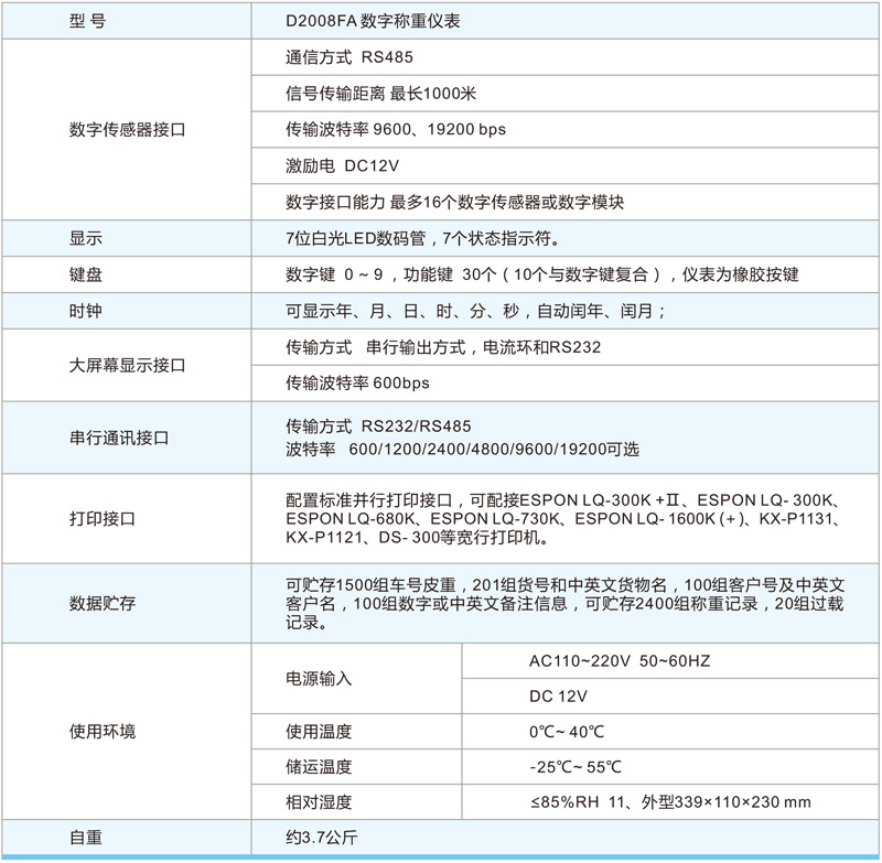 D2008FA數(shù)字稱重儀表主是用于汽車(chē)衡的數(shù)字稱重顯示控 制器,使用于1—16個(gè)C型和E型數(shù)字傳感器的靜態(tài)汽車(chē)衡系統(tǒng)。